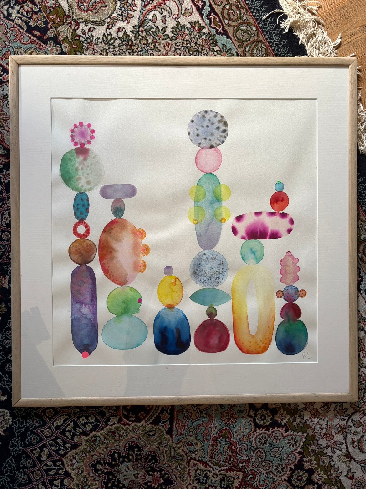 Balans in Kleur is een uniek handgemaakt abstract kunstwerk van 80×80 cm. Het werk bestaat uit speelse, organische vormen die in perfecte harmonie op elkaar lijken te balanceren. Door het gebruik van transparante waterverf ontstaan zachte kleurovergangen, levendige details en een frisse, moderne uitstraling.