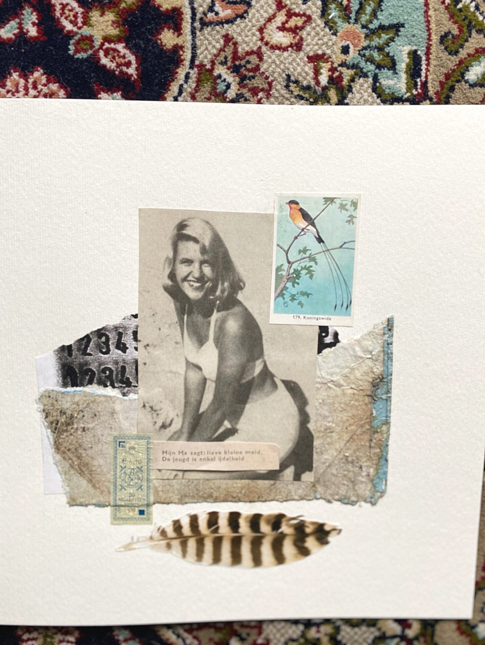 Elke collage is met de hand gemaakt op hoogwaardig aquarel papier (300 g/m²), waardoor de kleuren en texturen prachtig tot hun recht komen. Van poëzieplaatjes tot luciferdoosjes, van oude foto's tot stickers en postzegels, elk element is zorgvuldig gekozen om een verhaal te vertellen.